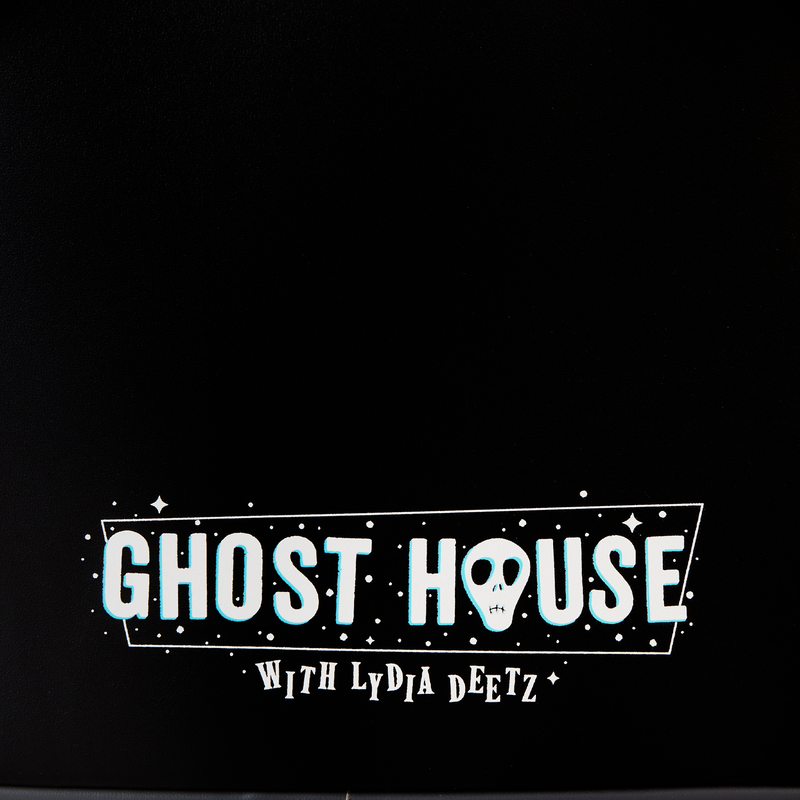 Co-ghost a show in style! Take along our Beetlejuice Beetlejuice mini backpack, featuring Lydia Deetz’s hauntingly fashionable flair. A textured twill material makes up Lydia’ Deetz’s jacket, which extends to the tops and sides of the backpack. Her collared shirt is an applique detail, and real buttons run the length of the coat. A gray checkered outfit underneath coordinates with the jacket. Flip the backpack around, and you’ll find the words “Ghost House with Lydia Deetz” on the back. Pack your daily essentials and prepare for spine-tingling adventures.
