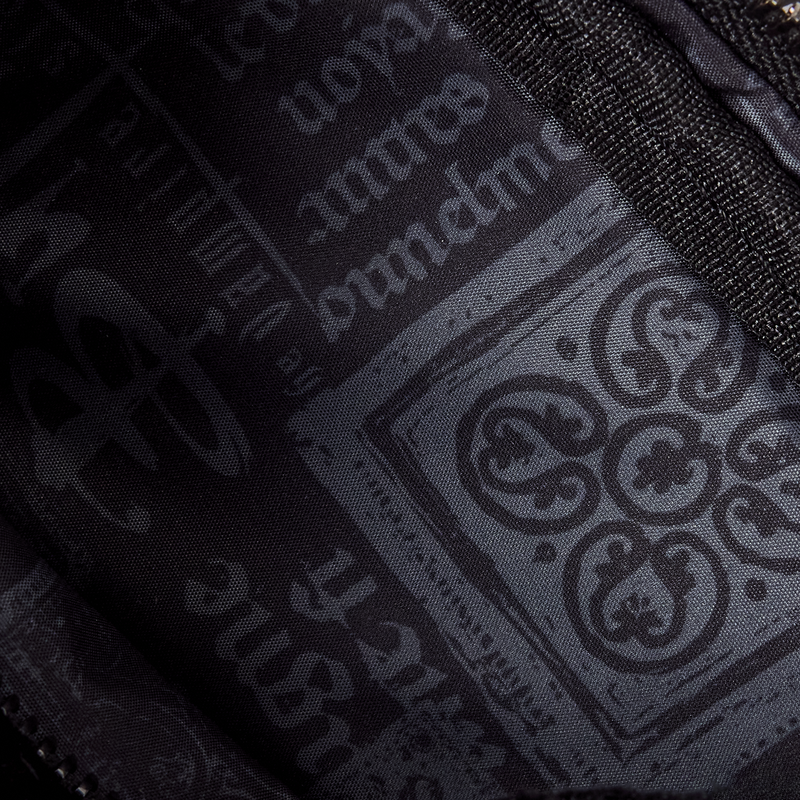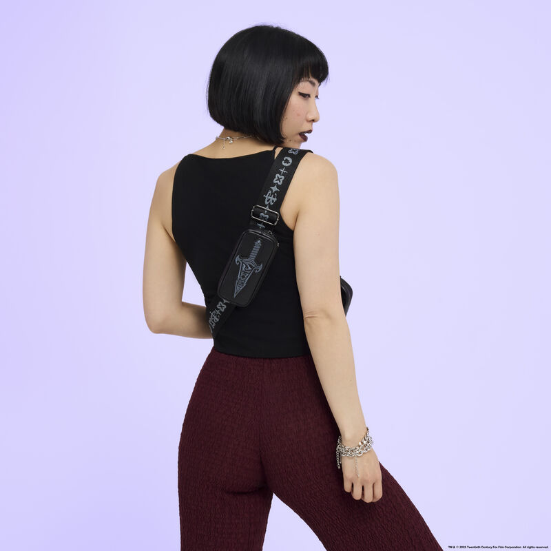 This sling bag is inspired by Buffy the Vampire Slayer. It’s made of black velvet with motifs from the show “burned out” of it. You’ll find distressed leather accents and a metal charm of a “B” in the Buffy font. Plus, there’s a coin bag attached to the strap that features Buffy’s dagger.