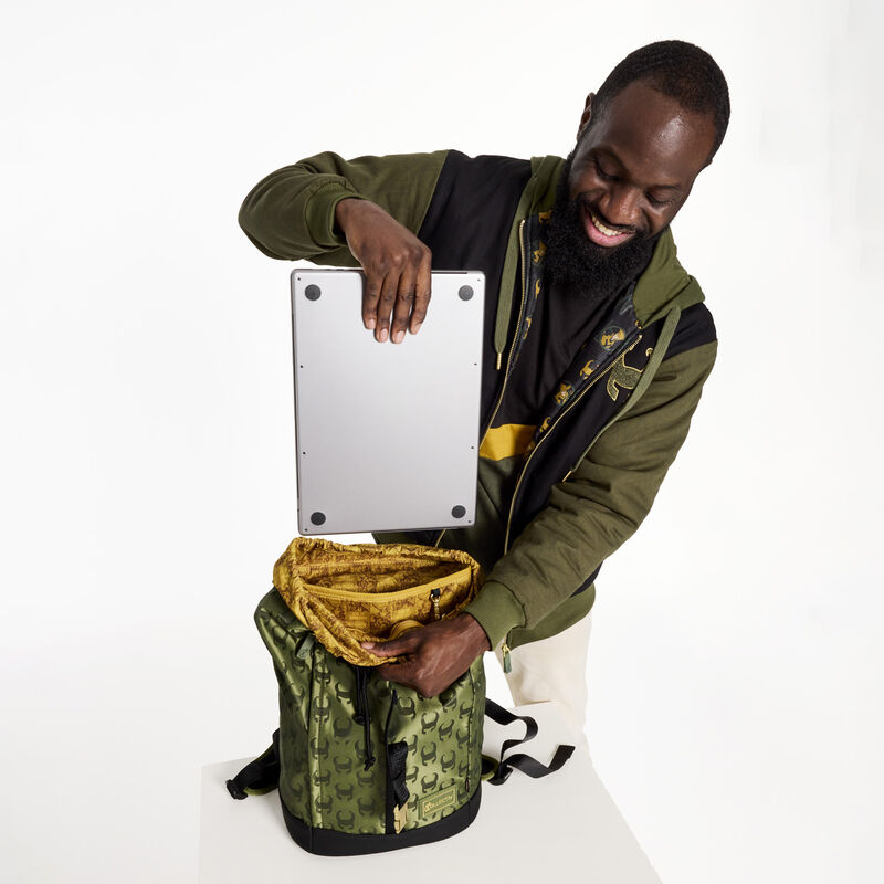 The Loungefly COLLECTIV Marvel Loki The TRAVELR Full-Sized Backpack features shiny gold-colored metal hardware, vegan leather (polyurethane), nylon, adjustable shoulder straps, mesh material, and applique, debossed, and printed details. Note the coordinating inside lining.