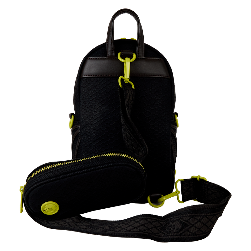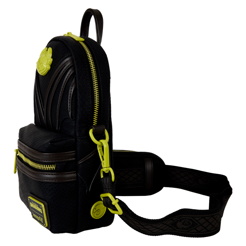 Faux alligator leather brings this bag to life and gives it a dragon feel. Find a molded metal charm of a dragon at the top! Wing-inspired designs on the front and sides bring the whole look together.